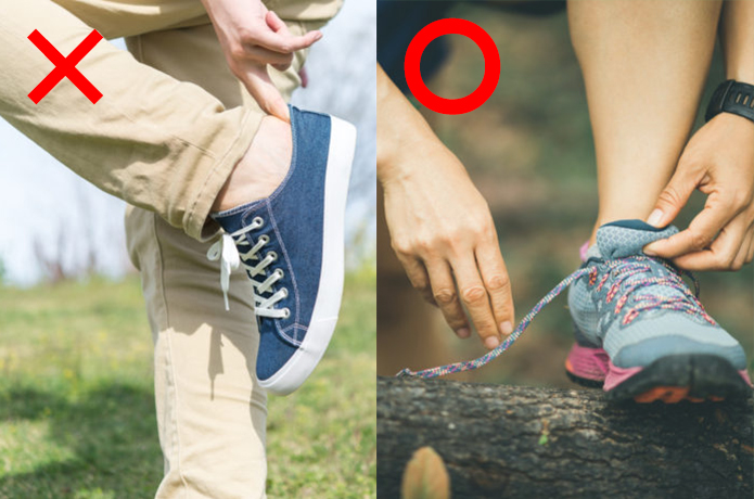 とはいえ「スニーカーなら何でもいい」という訳ではありません。上記左フォトのようなタウン用スニーカーはNGです。一番の理由は『滑りやすいから』。コンクリートの道を歩くわけではないので、凹凸の少ないソールは不整地を歩くには向いていないと言わざるを得ません。お手持ちのシューズなら少なくともスポーツ用のスニーカー、できればソールが少し厚めでクッション性に優れ、ぶかぶかすぎないものが好ましいです。